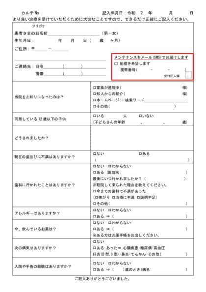 ご来院の際にスムーズに受付を済ませていただけるよう、当院のホームページから問診票をダウンロードし、事前にご記入いただけます。 あらかじめご記入いただいた問診票をご持参いただくことで、当日の待ち時間を短縮することが可能です。 問診票の画像をクリック(またはタップ)するとダウンロードできますので、印刷してご活用ください。